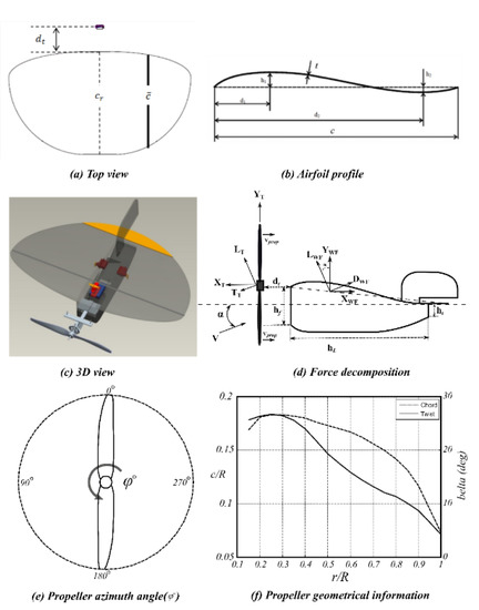 MAV and propeller geometrical descriptions, (a) Mav in top view, (b) airfoil profile, (c) MAV in 3D view, (d) aerodynamic force decomposition, (e) propeller azimuth angle, and (f) propeller geometrical information(chord and pitch angle distribution).