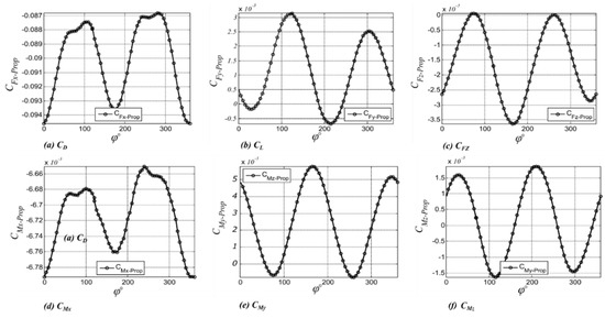 Propeller time history aerodynamic forces coefficient development, (a) drag coefficient, (b) lift coefficient, (c) side force coefficient, (d) rolling moment coefficient, (e) yawing moment coefficient, and (f) pitching moment coefficient.