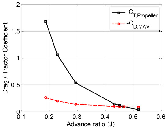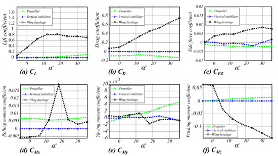 The drag coefficient, in Figure 7b, increased continuously with the angle of attack when the rotational speed was fixed at 555 rad/s. A nearly constant thrust was produced by the propeller with various angles of attack (CT is roughly around −0.09). The main drag force was formed from the wing-fuselage. The vertical stabilizer, however, showed a negligible drag contribution for the entire range of incidences.