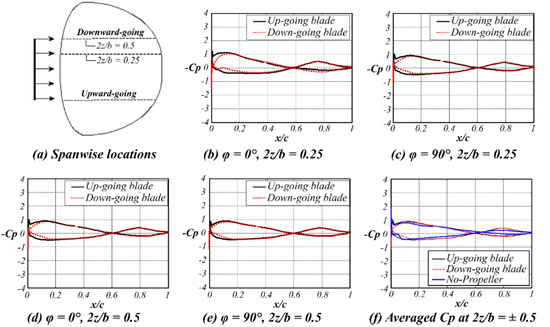 In general, the propeller slipstream had a significant effect on both positive and negative lift. Identical negative lift was mainly generated at reflex camber area for both downward- and upward-going blade sides and asymmetrical forces were produced at the positive camber region due to stronger propeller slipstream, as shown clearly from the pressure distribution in Figure 8.