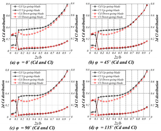 Instantaneous Cl, Cd distribution at various propeller azimuth angles at ω = 555 rad/s, (a–d) lift and drag coefficient distribution along the wing span with changing of propeller azimuth angle from .