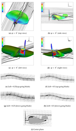At , the leading edge separation bubble formed on the upper wing surface and it was located near the center plane region, as shown in Figure 10i. The low pressure region, as marked with dark blue color, can be clearly seen on the upper surface, indicating the asymmetric flow due to the propeller slipstream effects. On the lower wing surface, two separated and asymmetric bubbles formed underneath the wing near the leading edge. The smaller bubble formed on the upward-going blade side and the larger one on the downward-going blade side. The shape of the bubble at different spanwise locations can be found in Figure 10e–h. The areas with relative larger pressure force were on the lower surface at the up-going blade side (Figure 10d). This was due to the propeller tangential flow impinging on the lower wing surface. However, on the down-going blade side, the tangential flow impinged on the upper surface instead.