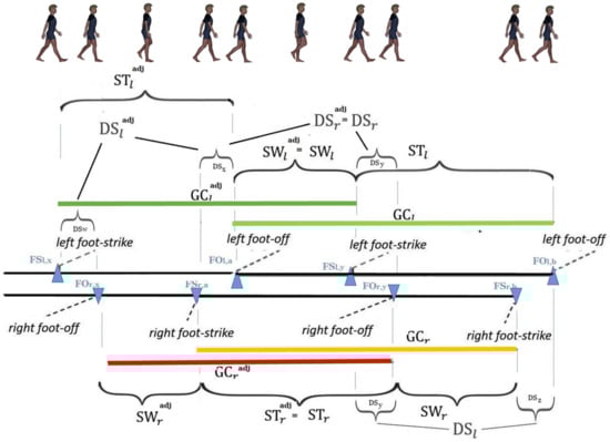 Consider the walking gait [19,33] and let: GC stand for gait cycle; FS stand for foot strike; FO stand for foot off; r and l stand for right and left, respectively; adj stand for adjoint; ST stand for stance; SW stand for swing; and DS stand for double support. The reader is referred to the comprehensive modelling of Figure 1, which reports the right and left gait cycles, with durations , , as the time intervals (or phases) between two consecutive strikes of the right foot (, ), and two consecutive lift off of the left foot (, ), respectively, such that the same right swing phase appearing in the left stance phase is the one that is involved in the definition of the right gait cycle. Analogously, the adjoint right and left gait cycles, with durations , , are the time intervals (or phases) between two consecutive lift offs of the right foot (, ) and two consecutive strikes of the left foot (, ), respectively, with and immediately preceding and , respectively. As clarified in [25], each stance includes both the double support subphase with the left foot behind and the right foot ahead and the double support subphase with the right foot behind and left foot ahead. Accordingly, the double support consistency consists of the equal partition of the double support sub-phases, i.e., (and , ). With respect to this, it is worth recalling that gait symmetry and recursivity often decay in pathological walking.
