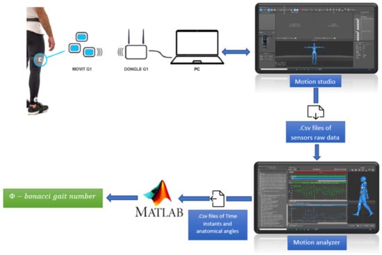 Flow chart. The wearable wireless sensors start to acquire and record the movement data in their internal memory with a sample rate of 200 Hz after the recording button is pressed on the user interface of the Motion Studio software. The movement data (.csv file) for each sensor are downloaded using the Motion Studio software by connecting all the sensors to the PC via the USB cable. The data file contains: device name, bone name, timestamp, 3-axis accelerometer data in unit “g”, 3-axis gyroscope data in unit “dps”, accelerometer/gyroscope range, and sample rate. The sensor data file is loaded in the Motion Analyzer software for data fusion and processing to generate the time instants of the heel strike and toe off for the left and right feet, in addition to the anatomical angles. The aforementioned information coming from data processing is loaded in a dedicated MATLAB algorithm that recognizes the time instants for the gait cycle and the adjoint gait cycle subphases, involved in the computation of the -bonacci gait number.