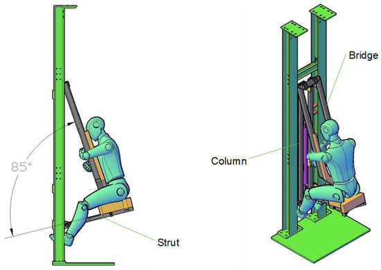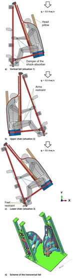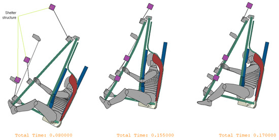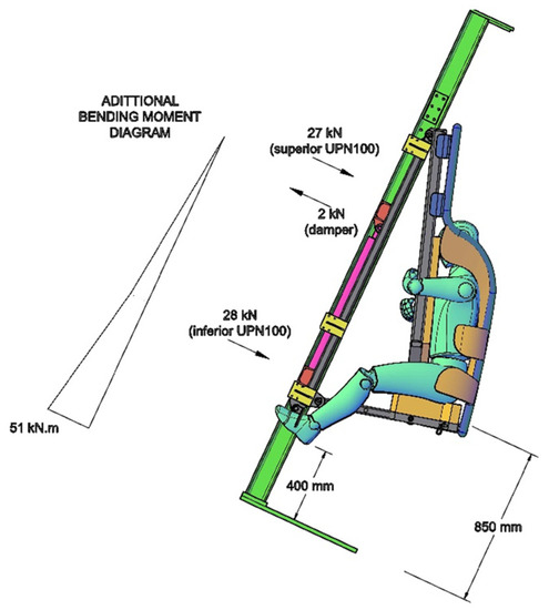 The movement is, in an initial phase (about half a tenth of a second), essentially vertical, accompanied by clashes between the occupant’s chest and the cushions that surround it. As the damper device reduces the speed of the chair structure and the body adapts to the seat cushion, the damper is much more effective in the vertical direction, by reducing the velocity in this direction, but not in the horizontal one. The chair then shows a tendency to move horizontally outwards the shelter at its lower end, being restrained by the bumpers of the lower UPN100 profile (Figure 2). With these clashes, as mentioned, the body is then projected backwards—the back against its cushions in the first place, followed immediately by the head against its back cushion.
