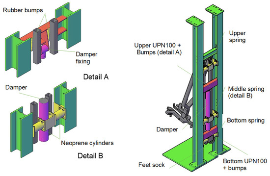 To complete the system, a spring set of three pairs of neoprene blocks are installed (Figure 2, detail B), one pair at the top, one intermediate and one at the lower connection point. The springs make use of the high distortional capacity of neoprene, as seen in bridge bearing pads or in earthquake-based isolation systems. The neoprene blocks present a shear modulus () of 0.3 MPa and a damping coefficient () of 10%. The blocks at the middle and bottom positions are cylinders with Ø 60 × 100 mm length, while the neoprene blocks of the upper position present a square section of 67 × 67 mm2 and a length of 160 mm. Aimed at reducing the movement of the upper fixation point of the chair in the horizontal direction to an acceptable level, the effective (free) length of the top pair of springs was reduced by 50%.