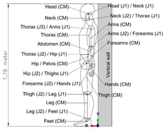Figure 5 presents the assembly of the human body model projected in the sagittal plane, with reference to the centre of mass (CM) and the number of connection joints (J1 or J2) of each element. The geometric characteristics and mass values are presented in Table 2. In Figure 5, the vertical and horizontal axes (YY and XX, respectively) refer to the base of the outer face of a vertical wall, while the human body leans against it in the reference anatomical position (straight-up position). The model has a total mass of 78 kg and is 1.78 m tall in this position, which corresponds to the 50th percentile of a male according to the GEBOD program [9]. As an average male model is heavier than female and infant models, it is expected that the male will suffer higher inertial forces and more severe injuries. Further studies, however, should also comprise those other situations.