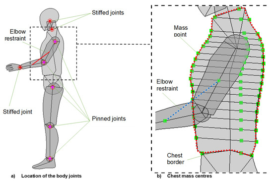 According to the consulted bibliography, the behaviour of some joints presented in Figure 5 is well known, namely the head–neck joint (known as atlas and axis joints [11]), the chest–forearms (glenohumeral joints [12]), the chest–hip (sacroiliac joint [13]) and the hip–thighs (femoral capsules). Except for the chest, the assembly of the body units was established through the use of two types of connections: an articulated one that allows for free rotation between the connected nodes, and a rigid one that does not allow for such rotation (Figure 6a). Between the centres of mass of the forearms and arms, an elbow restraint was established to avoid an angle higher than 180 degrees between those parts.