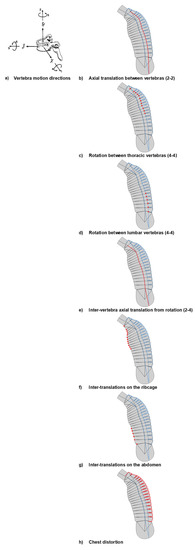 To compute the displacements and rotations between the vertebrae [17,18,19,20], it was considered that the intervertebral discs concentrate all the deformation capacity of the spine. An axial stiffness k2-2 of 1000 N/mm was assumed (Figure 7b). Similarly, a rotational stiffness k4-4 of 140,000 N·mm/rad was established for rotations between thoracic vertebrae (Figure 7c) and of 35 N·mm/rad when a lumbar vertebra is involved in the rotation (Figure 7d). There is also a cross stiffness (k2-4) present, defined in the model by an axial stiffness, with an offset of 40 mm [20] from the column axis (Figure 7e). The linear stiffness has a value of 25 N/mm, resulting in a k2-4 = −1000 N·mm/mm. The term k2-4 is negative as a result of the assumed positive directions on the vertebrae movement (Figure 7a).