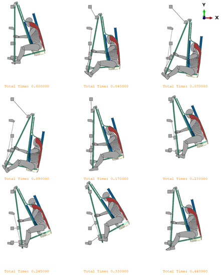 Afterwards, there is a series of bounces against the pillows that surround the human body, repeating and decreasing in intensity as they occur. This upwards movement ends with the impact of the shoulders on the upper part of the back cushions (Figure 10, Time = 0.230 s), followed by a new impact of the head against its back, in a much higher position than in the first impact. Since the initial instant, about four (4) tenths of a second have passed, and velocities as well as accelerations in the chair and in the human body have decreased, reaching much lower values. The vertical downwards movement resumes, not necessarily in the same way, but with the generic features of the first cycle and with less intensity.
