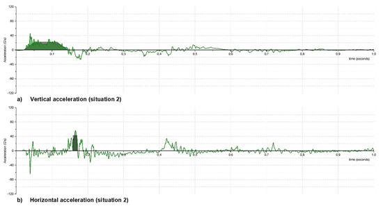 For the spine, the upwards vertical accelerations (Figure 13a) are significant at the beginning of each analysis, reaching their highest absolute values when the damper tends to lead the velocity in this direction to zero, which happens before the first tenth of a second. Once these maximums are passed, with the impact on the bumpers, a second set of maximums appears, with an opposite sign and with absolute values greater than the first ones, in the case of tilted falls (situations 2 and 3).