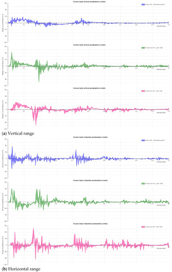 The mean accelerations of the human body (weighted by the masses of each body part), through directions XX (horizontal) and YY (vertical), can be compared with human tolerance curves, such as “Eiband curves” [40], plotted based on experimental results, in which astronauts were subjected to high accelerations when seated on a rigid seat and pressed against it by a harness. When using these curves, trapezoidal seat acceleration pulses are compared with the limits established in these curves, where not only the maximum acceleration value of the pulse is important, but also its duration. As in this study, the occupant may suffer some relative movement in relation to the chair, and the comparison pulses were traced such that the area of the diagram with the evolution of accelerations over time coincided with the area of the trapezoidal pulses.