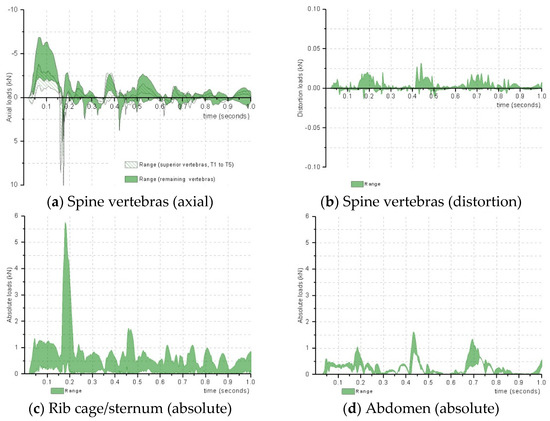 The upper thoracic vertebrae (T1 to T5) turn out to be the least compressed, not only because the chest/sternum supports part of the axial load, but also because the rotation of the body to the fetal position (bracing for impact) compresses the thoracic cage more (in particular the sternum) and relieves the compression of the spine. In this movement, the rib cage is subjected to a force lower than 2 kN (Figure 14c). The absolute maximum of the force supported by the rib cage occurs with the frontal impact of the chest against the cushion, when it reaches a value of almost 6 kN.