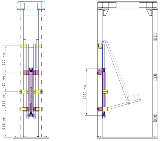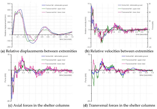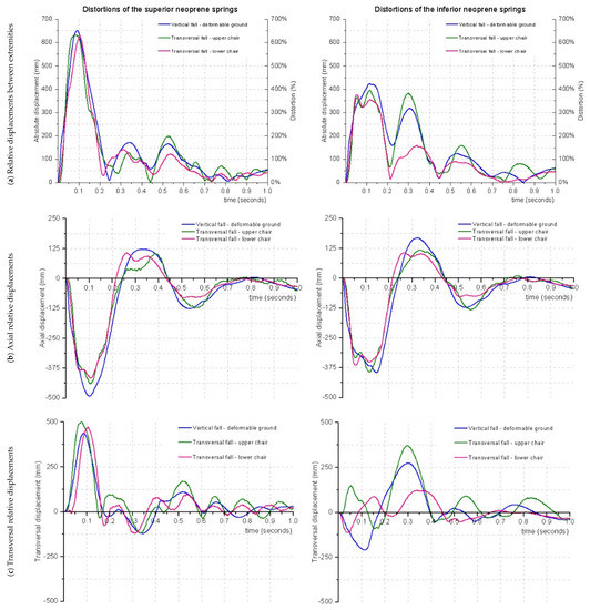 The values of the distortional components transverse to the shelter columns differ among each situation, with negative values corresponding to movements outside the shelter limits. For the lower and intermediate springs, this movement out of the shelter depends on the falling situation, being less relevant for the tilted fall on the raised chair (situation 2) and more significant for the vertical fall (situation 1, Figure 10). In the latter, the chair columns theoretically come out of the shelter’s limits for about 110 mm (210–100 mm, where 100 mm corresponds to the gap between those columns and the limits external shelter boundary).