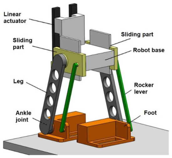 In this work, a biped walking robot (Figure 21) was designed based on a concept that envisaged the use of six actuators. Two rotary and two linear servomotors were designed to allow the robot to walk and the other two rotary actuators were used to change the direction of movement. The concept was based on a parallelogram that ensured a constant parallel relationship between the base and the robot’s feet.