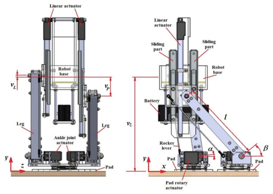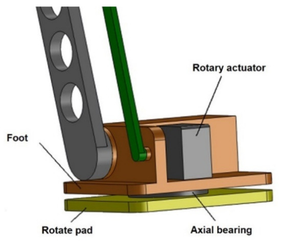 The robot design involves a combination of a linear connection and a parallelogram, which aims to create a permanent parallel relationship between the feet and the base of the robot (Figure 1). The robot consists of four planar rotary joints and two equally long parallel rocker levers. The rotary oscillating movement of this mechanism is ensured by a rotary actuator located in the robot’s foot, meaning the resulting center of gravity of the robot is as low as possible. A linear actuator is used to drive the linear link, which adjusts the vertical position of the parallelogram (Figure 1). The advantages of this concept also include the easy adjustment of the height of the robot’s base by means of simultaneous insertions or retractions of linear drives. In order to be able to turn the robot sideways, the design is supplemented by a solution that allows one to change the direction of walking. Two other rotary actuators are used for this, which rotate the rotating pads located under the feet (Figure 2). In total, this robot concept requires only 6 actuators, which is a smaller number of actuators than in other existing biped robot concepts.