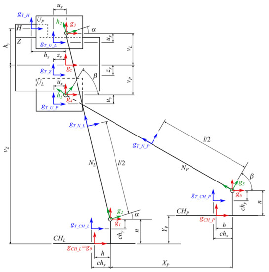 g…, h…—local coordinate systems of the main points of the kinematic chain;