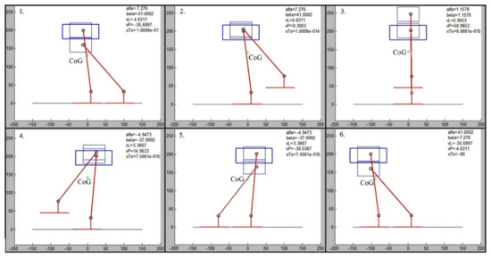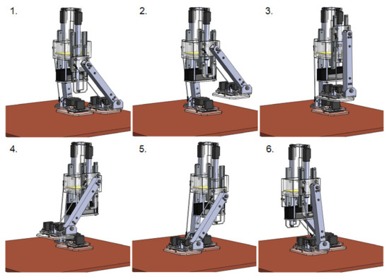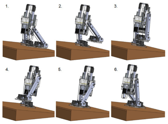 Snapshots sequence from a step simulation of a pad with an 8° uphill slope. Legends: 1—the center of gravity of the robot is above the right foot; 2—the left linear actuator performs the upward stroke of the left foot; 3—the left ankle joint rotates to move the left foot forward and at the same time the right ankle joint balances the robot’s pose to the vertical position of the legs; the right linear actuator also works to keep the base at a constant height; 4—the left ankle joint transmits the left foot forward and at the same time the left linear actuator lowers the foot; the right linear actuator also lifts the base to keep it at a constant height. 5—the left foot is lowered to the ground; 6—both ankle joints rotate so that the center of gravity is transferred above the left foot and at the same time the height position of the base is compensated by the movement of both linear actuators.