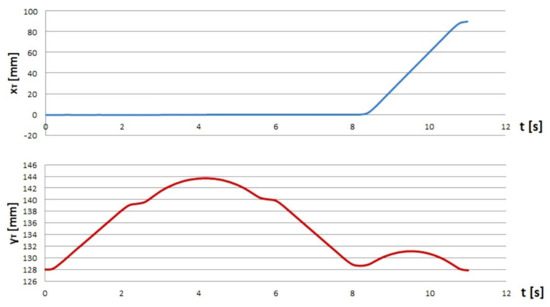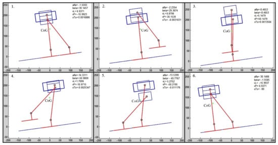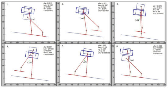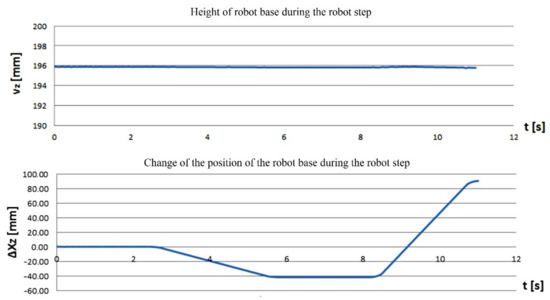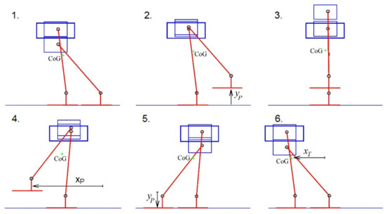 Since the feet of the proposed walking robot are overpassed, the position of the z-axis coordinate projection from the center of gravity in the supporting base of the robot is always ensured in all circumstances. For this reason, the suitable positioning of the center of gravity projection is focused on the x-axis component of the robot’s center of gravity.