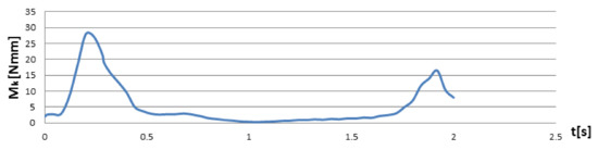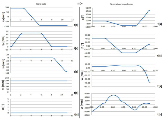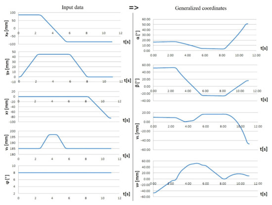 In a similar way that the step-by-plane simulation is created, the step-by-plane simulation is created. The calculation in the MATLAB environment is used again, with the help of which the graphs of generalized coordinates are calculated (Figure 19).