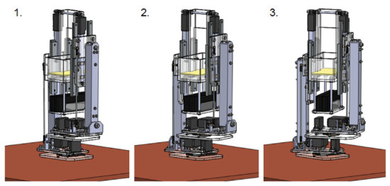 The used non-anthropomorphic concept also has advantages compared with wheeled, tracked, and quadruped concepts. Wheeled and tracked undercarriages copy the terrain during locomotion and cannot stabilize the robot’s base vertically, as this would require an additional steering mechanism. The animal-inspired quadruped locomotion is achieved using articulated kinematic structures with center of gravity transfer by tilting and transferring the center of gravity to the supporting polygon formed by the legs. The complexity of the quadruped concept means it is not suitable for vertical stabilization of the robot’s base.