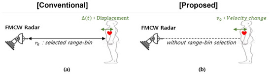 Comparison of conventional and proposed approaches. (a) Conventional method to measure respiration using the displacement between the radar and subject’s chest, which changes owing to the subject’s respiration. (b) Proposed method to measure respiration using the change in chest velocity, which changes owing to the subject’s respiration.