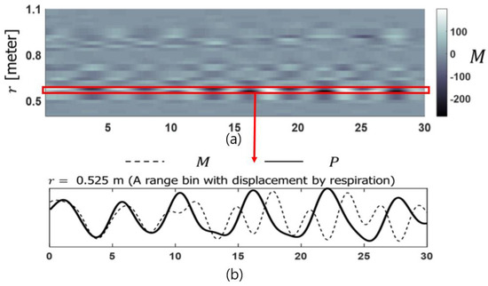 Radar signal extracted for respiration measurement. (a) The magnitude at various distances , (b) the magnitude change in m according to the chest’s up and down movement.