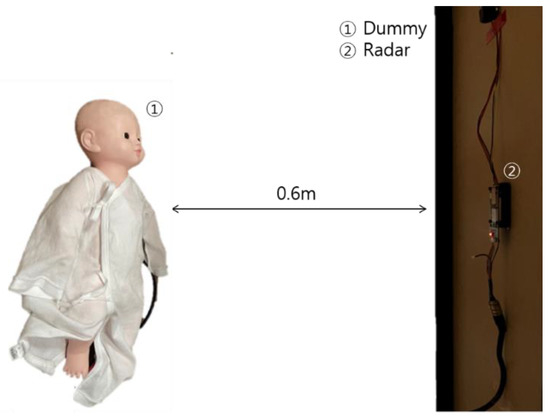 An additional experiment was conducted to demonstrate that a respiration measurement is possible with the radar used in this paper. The experiment shown in Figure 3 was conducted using a dummy (“Sakamoto Baby Touch”–Vital Sings Simulator, M179) whose chest displacement, due to respiration, was less than 0.05 m (5 cm). The respiratory rate per minute was set at 20 and the heart rate per minute at 120. The distance between the radar and the dummy was about 0.6 m.
