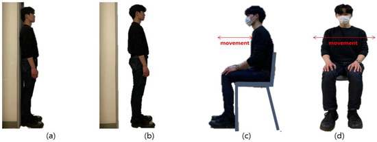 Subject’s postures and movements: (a) leaning against the wall; (b) without leaning against the wall; (c) moving forward and backward; (d) moving left and right.