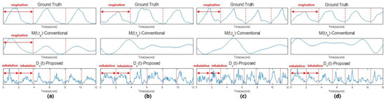 In the conventional method, , inhalation, and exhalation appear in one cycle. However, in the proposed method, exists separately in one cycle each of inhalation and exhalation, according to Equation (5). As depicted in Figure 7, in environment (a), in which the human body is in a stationary state, the outputs of the proposed and conventional methods are accurate respiration signals with a constant cycle. In experimental environments (b), (c), and (d), which include movements other than respiration, the correct respiration signal is extracted from . In contrast, when using , a distorted signal is extracted, owing to the addition of displacement caused by movement other than respiration.