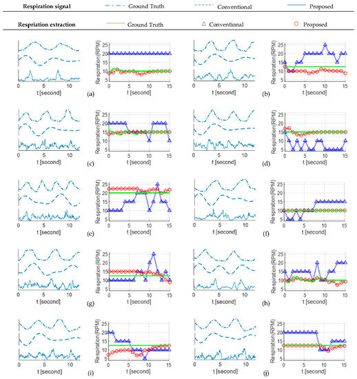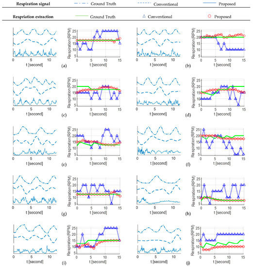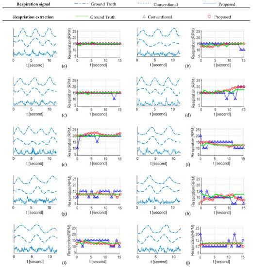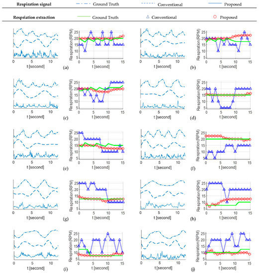 Respiration extraction results for the case shown in Figure 5a. (a) Subject #1, (b) Subject #2, (c) Subject #3, (d) Subject #4, (e) Subject #5, (f) Subject #6, (g) Subject #7, (h) Subject #8, (i) Subject #9, and (j) Subject #10.