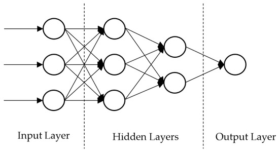 The architecture of an ANN is determined by the data type and desired output. The feedforward neural network algorithm is primarily used to predict the failure pressure of corroded pipelines. This form of ANN architecture (Figure 1) is designed to learn from paired datasets, in which the model is trained using one or more inputs and the matching output of the training dataset. A feedforward neural network is simple to implement and is well-suited for delivering a single output. Generally, a feedforward neural network is used with the Levenberg–Marquardt backpropagation approach to train the model, as it performs well and requires less time and epochs for convergence [21].