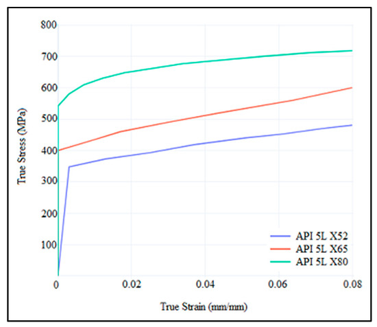 True stress–strain curves for API 5L X52 [2], X65 [3], and X80 steel pipes [18].