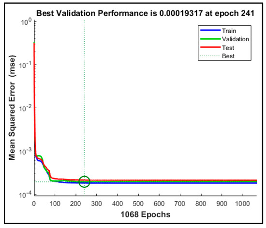 MathWorks MATLAB R2021b was used to develop an artificial neural network with the Levenberg–Marquardt backpropagation algorithm. This algorithm falls under the supervised learning paradigm, where the neural network is presented with a set of input parameters and the expected output [40,42]. This algorithm is efficient due to its second-order convergence rate, which requires lesser convergence time. The input parameters of the model are the true ultimate tensile stress, normalised defect depth, length and spacing, and normalised axial compressive stress. The corresponding output of the ANN is the normalised failure pressure of the pipe obtained using FEA. Noise was not introduced as part of the modelling data as the presence of noise in the training data set will increase the complexity of the model and learning time, which degrades the performance of the learning algorithm. An ANN with one hidden layer and seven neurons in the hidden layer was developed using 1353 datasets. The training parameters of the ANN are summarised in Table 8. The best validation performance of the ANN was observed at epoch 241, as illustrated in Figure 4. Fifteen percent of the training dataset was reserved as the validation dataset and was not introduced to the ANN during training.
