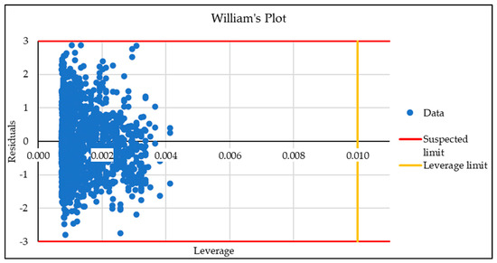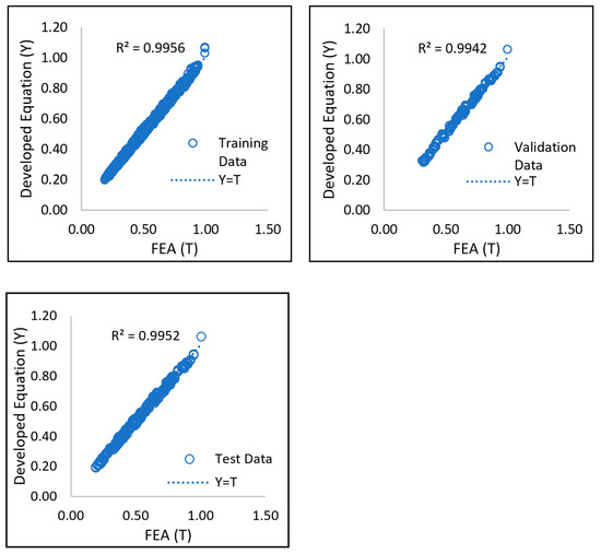 The MAE, MSE, and R2 value of the model for each of the training, validation, and test phases are summarised in Table 9. Figure 6 represents the William’s plot of the ANN. As illustrated in Figure 6, the failure pressure data falls within the valid region of 0 < h < 0.01 and −3 < SR < 3. The implementation of the leverage strategy established the statistical validity of the developed model.