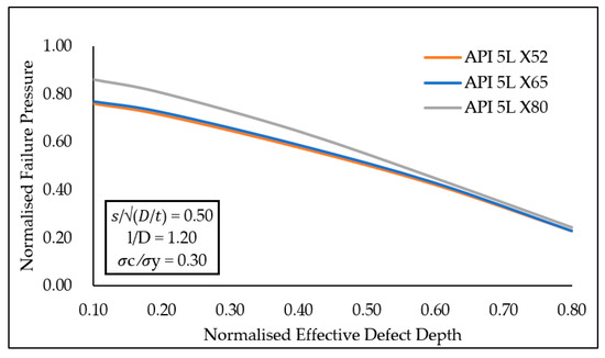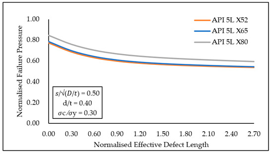 As for the effects of defect depth, as the defect depth increases from 0.10 to 0.80, the failure pressure of the corroded pipe drops drastically with a maximum decrease of 71.88% for a normalised defect spacing of 0.50, a normalised effective defect length of 1.2, and a normalised axial compressive stress of 0.30 for a high toughness pipe (API 5L X80). It was observed that, beyond a normalised effective defect depth of 0.60, the normalised failure pressure of the three pipe grades begins to converge and overlap, as illustrated in Figure 10. Under all other conditions, the normalised failure pressures of the three materials exhibit the same failure pressure trend.