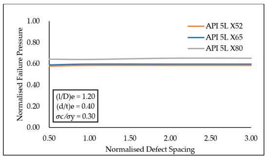 Based on Figure 9, as the normalised defect spacing increases from 0.00 to 3.00 for a normalised effective defect length of 1.20, a normalised effective defect depth of 0.4, and a normalised axial compressive stress of 0.30, the failure pressure also increases (a maximum of 0.95%) due to the decrease in stress–strain overlapping regions. These results are consistent with the former literature [18,32,43]. Under all other geometric conditions, for a change in the parameters, the normalised failure pressures of API 5L X52 and X65 pipes are almost similar with a maximum percentage difference of 1.26%. However, the normalised failure pressure for high toughness pipe material is relatively larger, with a maximum percentage difference of 9.48%.