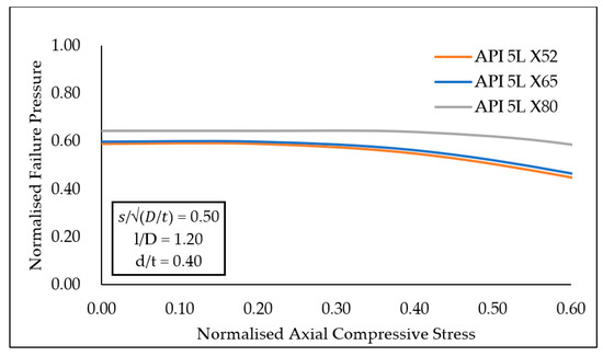 Failure pressure predictions for API 5L X52, X65, and X80 pipes for multiple normalised axial compressive stress.