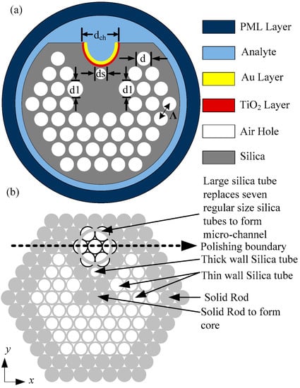 In recent years, intensive efforts have been devoted towards designing D-shaped PCF sensors because they enhance the sensing performance as the energy transfer increases from core to plasmonic mode due to a closer distance between the plasmonic film and core of the PCF [19]. To fabricate the D-shaped PCF sensors, a portion of PCF is polished by the side-polishing process, and the plasmonic film is placed over the flat surface [19]. For example, a flat surface-based D-type PCF sensor with a hollow core was proposed in [20] and using spatially distributed bimetallic layers was proposed in [21]. However, a deep polishing depth increases the fragility of the PCF, and the flat surface of D-type PCF needs to be smooth, otherwise a nonuniform sensing surface arises that affects sensing performance. The sensing performance increases significantly by introducing a microchannel in the PCF sensor because of the reduction in separation of the sensing layer and core region. For example, a microchannel-based D-shaped sensor showed maximum sensitivity of 27,800 nm/RIU for RI range of 1.37 to 1.41 [22]. A hexagonal lattice D-shaped PCF sensor containing an open ring channel was proposed in [12] that can detect RI from 1.20 to 1.29 with a low wavelength sensitivity of 11,055 nm/RIU. This sensor requires extra care to make a D-shape, otherwise at the stage of the side-polishing process of the PCF side, air holes of the open ring may be damaged. A PCF sensor with two microchannels was designed to detect RI from 1.23 to 1.29 with a maximum sensitivity of 13,000 nm/RIU [23]. The problem with the sensor is that double sides of the PCF need side polishing to obtain a D-shape with microchannels on both sides of the PCF. Moreover, the sensor has low sensitivity and a low detection range. Microchannels not only improve the performance of the D-shaped sensors but also boost the sensing performance of the circular-shaped PCF sensors. For example, a U-shaped microchannel in a circular-shaped PCF next to the core showed maximum sensitivity of 66,000 nm/RIU and a wider sensing range [13]. However, the problem of the microchannel-embedded PCFs is the difficulty of the fabrication of the channel by using a focused ion beam or laser micromachining process. The sensing layer can also be placed close to the core in the case of exposed core grapefruit fiber-based sensors to increase performance [24,25,26]. Additionally, in suspended core microstructured-fiber, the sensing layer is close to the core that can detect multi analyte [27]. Besides SPR-based RI sensors, other new RI sensors such as long-range SPP and Bloch surface wave based sensors are proposed to detect RI effectively [28,29].