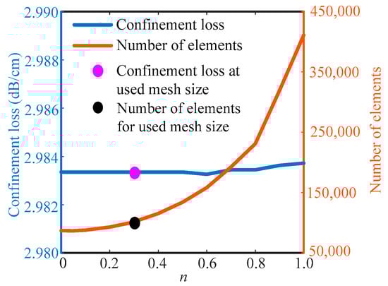 To numerically explore the optical properties of the proposed sensor, finite element method (FEM)-based commercial software COMSOL Multiphysics is used. For computational purposes, we use a circular perfectly matched boundary to attenuate all electromagnetic radiation that arrives at the boundary. Maximum mesh size is found by for the entire geometry, where n is the mesh size parameter that increases up to 1 and is the operating wavelength. Figure 2 shows the confinement loss and the maximum number of elements as a function of n. In this model, the region of silica is much larger compared with the air-gap regions. From Figure 2, it can be seen that confinement loss remains almost constant for n< 0.6. Therefore, to make the computation process faster, we use 100,168 elements.