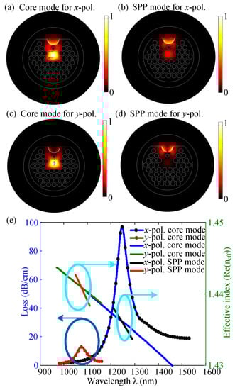 Asymmetrical structure of the PCF results in the existence of birefringence. Therefore, light propagating inside the fiber shows x-and y-polarizations of the fundamental and SPP modes, as shown in Figure 3a–d.The field distribution of these modes is shown for the analyte RI = 1.43 at the resonant wavelengths. Figure 3e demonstrates the RI and confinement loss as a function of wavelength for the fundamental and the SPP modes for both x- and y-polarizations. It is seen that resonance occurs at the phase-matching wavelength that results in maximum energy transfer from the fundamental modes to the SPP modes, and confinement loss becomes maximum for both polarized lights. For example, phase matching or resonant wavelengths are 1250 nm for x-polarization and 1080 nm for y-polarization. Additionally, the peak confinement losses at the resonant wavelengths are 97.04 and 12.89 dB/cm for x-and y-polarizations, respectively. As the operating wavelength, red/blue shifts far from the resonant wavelength, and the confinement loss approaches its tail from the peak loss. From Figure 3, it is noted that at the resonant condition, energy transmission increases significantly from the core to the SP for the x-polarized field compared with the y-polarized field because of efficient excitation of metal electrons by the evanescent wave. As a result, we consider sensor optical characteristics for x-polarization.
