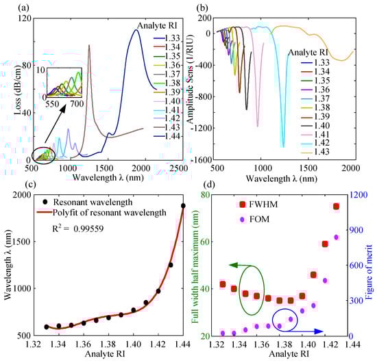 Figure 4c. From resonant wavelengths, it is found that the R-squared value of the sensor is close to unity (i.e., R2 = 0.99559), which indicates the sensor is highly linear. The full width at half maximum (FWHM) is found from the loss spectra of different analyte RI and plotted in Figure 4d and shown in Table 1. The FWHM decreases with the increase in the analyte RI and reaches a minimum for RI = 1.39 and increases again with the increase in analyte RI. The FWHM is used to characterize the sensor in terms of the figure of merit (FOM), which is a ratio of wavelength sensitivity to the FWHM. Figure 4d shows that FOM increases with the increase in the analyte RI. The highest FOM is 839 for analyte RI = 1.43 as shown in Table 1.