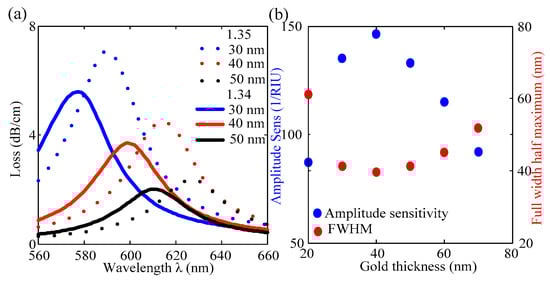Figure 5. Loss spectra of analyte RIs 1.34 and 1.35 are shown in Figure 5a for the gold thickness of 30, 40, and 50 nm. As the gold thickness increases, the peak loss component decreases due to the decrease in the depth of penetration of the electric field in the metal layer. For example, peak losses are 7.10, 4.42, and 2.36 dB/cm for the gold thickness of 30, 40, and 50 nm, respectively, in the case of RI = 1.35. The change in loss spectra affects the amplitude sensitivity and FWHM as shown in Figure 5b in the case of analyte RI of 1.34. From Figure 5b, it is seen that amplitude sensitivity reaches a maximum for the gold thickness of 40 nm. However, the FWHM is found to be minimum for the gold thickness of 40 nm. The change in gold thickness hardly affects the wavelength sensitivity; therefore, FOM (i.e., FOM = 25.21 in the case of analyte RI = 1.34) must have the highest magnitude at the gold thickness of 40 nm.