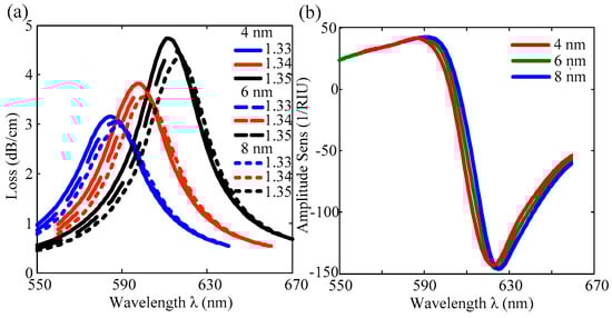 To determine the effect of thickness of the adhesive layer on the sensing performance, loss spectra are shown in Figure 6a for analyte RI of 1.33, 1.34, and 1.35. The penetration of electrical waves decreases with the increase in metal thickness. Therefore, in all cases of analyte RIs, the peak confinement loss increases with the decrease in the adhesive layer thickness. For example, the peak losses are 4.16, 4.22, and 4.62 dB/cm for analyte RI = 1.35 in the case of TiO2 thicknesses of 8, 6, and 4 nm, respectively. The amplitude sensitivities also altered due to the change in loss spectra. However, the effect of the TiO2 layer on the sensitivity is not significant. For example, for analyte RI of 1.34, the maximum amplitude sensitivities are 143.04, 145.89, and 146.21 RIU−1 for the TiO2 layer of 4, 6, and 8 nm.