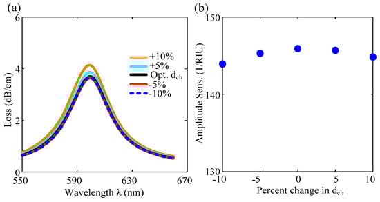 The distance between the semicircular-shaped channel and the core of the PCF is fixed in this sensor. However, the distance between the channel and the core of the PCF can be changed by varying the diameter of the channel. For the increase in channel diameter by +10%, the distance between the core and plasmonic layer decreases by −10%, which leads to the easy coupling between the core mode and SPP mode. As a result, energy shifts significantly from the core to the SPP mode, and the peak loss increases as shown in Figure 7a. However, the resonant wavelength remains constant for the change in the channel size within ±10% of the dch. Additionally, as the channel dimension decreases from the optimum value, there is no significant change in the energy transfer of the core mode to the plasmonic mode, as shown in Figure 7a. The channel dimension affects only the amplitude sensitivity, as shown in Figure 7b. From Figure 7b, it is found that the amplitude sensitivity is larger for the optimum channel size dch, and other values of dch result in lower amplitude sensitivities.