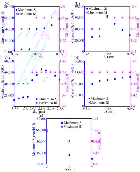 In Figure 8, the effects of sensor structural parameters on the maximum wavelength sensitivity and sensing range are further explored. Figure 8a shows that as the air hole diameter d1 increases beyond 0.6Λ, the sensing range raises to 1.44 from 1.43. The wavelength sensitivity Sλ increases significantly to 50,000 nm/RIU for d1 = 0.6Λ, and a further increase in d1 results in the gradual increment of Sλ. From Figure 8b, it is found that Sλ is maximum only for ds = 0.6Λ, and the sensing range remains constant at 1.44 for ds ≥ 0.6Λ. The sensing range and Sλ decrease with the decrease in ds. Even in the absence of the air hole with diameter ds, the maximum sensing range becomes 1.42. The effect of outer channel diameter dch is shown in Figure 8c. The maximum sensing range of 1.44 is obtained for dch ≥ 1.9Λ, and the maximum Sλ is found at dch = 2.1Λ. For dch = 2.2Λ, the maximum Sλ decreases only 3% from the maximum Sλ found at dch = 2.1Λ. The structural parameter d has no effect on the maximum sensing range for the values of d from 0.3 Λ to 0.9 Λ, as shown in Figure 8d. However, the maximum Sλ increases gradually with the increase in d. Figure 8e shows that the maximum sensitivity and sensing range is larger for the optimum pitch size of 2 µm.