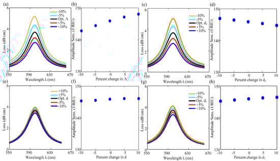 To investigate fabrication tolerance, the dependence of the sensing parameters is examined by varying all the structural parameters of the PCF sensor within ±10% of the optimized value. Figure 9a,b shows loss spectra and amplitude sensitivity, respectively, for the change in pitch. All air hole diameters depend on the pitch, so a reduction in pitch results in the opening of the leakage path. Therefore, a reduced pitch leads to an increment of confinement loss and vice versa. For example, as the pitch is reduced by −10%, the peak loss increases by about 40%. Since the resonant wavelength remains unchanged, the wavelength sensitivity stays unaffected by the change in pitch. However, the amplitude sensitivities are altered significantly by the alteration in pitch. For example, the amplitude sensitivity increases by 1.48% for the increase in pitch by +10%. Another structural parameter ds plays an important role in the sensing performance, as shown in Figure 9c,d. The air hole diameter ds regulates the evanescent wave that interacts with the plasmonic material. The smaller size of ds leads to a larger leakage path and more light to interact with the analyte. Thus, the energy transfer increases from the fundamental modes to the plasmonic modes for the reduction in ds. For example, the peak loss at the resonant wavelength rises by 36% from the optimum due to the −10% decrease in ds. Additionally, the amplitude sensitivity increases by only 0.72% for the −10% decreases in ds. However, the wavelength sensitivities are unchanged due to the change in ds, similar to the case of pitch change. The effect of air hole diameter d is shown in Figure 9e,f, and that of air hole diameter d1 is shown in Figure 9g,h. As one can see from Figure 9e–h, the effect of the change in parameters d and d1 is not significant because these parameters can hardly affect the leakage path. Therefore, peak loss and the resonant wavelength are almost the same, which leads to no noteworthy change in the wavelength and amplitude sensitivities.