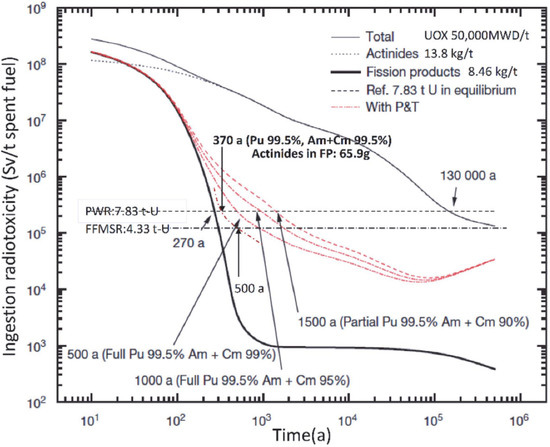 - Magill, J.; Berthou, V.; Haas, D.; Galy, J.; Schenkel, R.; Wiese, H.-W.; Heusener, G.; Tommasi, J.; Youinou, G. Impact limits of partitioning and transmutation scenarios on the radiotoxicity of actinides in radioactive waste. Nucl. Energy 2003, 42, 263–277. [Google Scholar] [CrossRef]