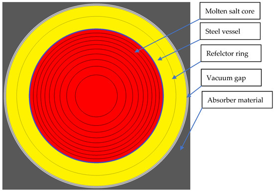 The model for this investigation, see Figure 2, is based on and developed from two recent publications [26,31]. It has been developed for the evaluation of the burnup and breeding performance in a molten salt reactor as well as for the study of potential reactor control through temperature feedback. To allow for this, this very specific 2-D model has been built to take care of the very important effect of neutron leakage from a molten salt reactor core. The ring type model (thin black rings indicate the grid) consists of the reactor core of variable size (red), surrounded by a stainless-steel vessel of 20 mm thickness (blue) and a sodium reflector of 50 cm thickness (yellow). The arrangement is surrounded by a thin vacuum gap (light grey rings) and the rest of the unit cell is filled with a strong absorber (dark grey) to avoid the reflection of leaking neutrons from the core/reflector system through the reflective boundary conditions of the code originally developed to represent a unit cell in an infinite repetition of a fuel assembly.