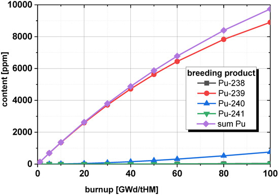 The detailed Pu breeding (Figure 5) shows the growth of the plutonium content from zero in the initial composition to almost 10,000 ppm at the final burnup composition. Long term all Pu isotopes show an asymptotic approach to a steady-state value characterised by the specific balance between the breeding and the fission processes. The plutonium vector is mainly dominated by Pu-239. The higher Pu isotopes take longer to form but long-term, Pu-240 shows an increased steady-state amount due to its lower fission cross section, whilst Pu-241, with its significantly higher fission cross section, has a lower steady-state amount.
